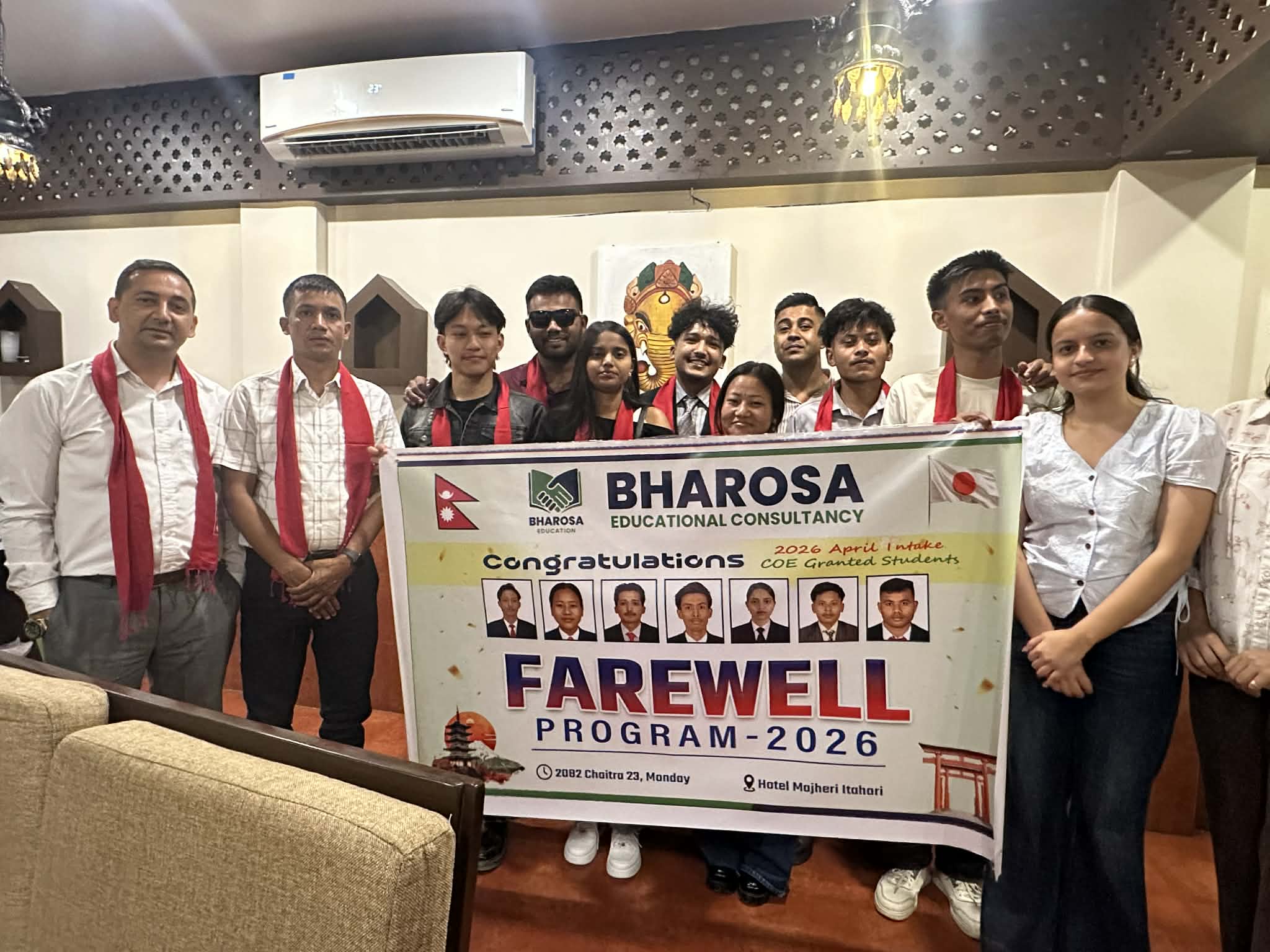 इटहरी । भरोसा एजुकेशन कन्सल्टेन्सीले भाषा अध्ययन पूरा गरी जापान जान लागेका विद्यार्थीहरूलाई सम्मानसहित बिदाइ गरेको छ। कन्सल्टेन्सीमार्फत जापानका लागि आवेदन दिएका सबै विद्यार्थीहरूको १०० प्रतिशत भिसा स्वीकृत भएपछि उनीहरूको सफलताका अवसरमा विशेष कार्यक्रम आयोजना गरिएको हो।